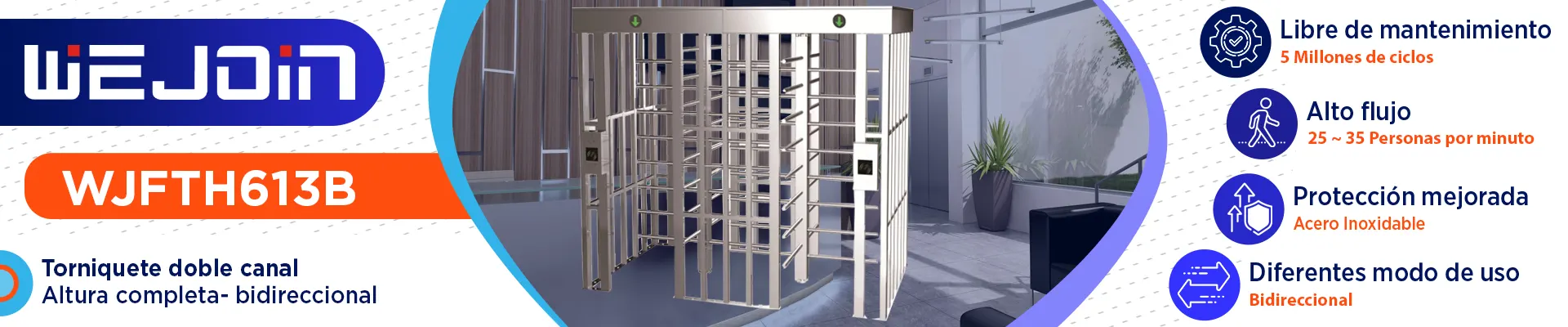 El WEJOIN WJFTH613B es un torniquete de cuerpo completo de doble carril bidireccional, construido en acero inoxidable grado 304, diseñado para uso en exteriores con protección IP68. Está fabricado para ofrecer un desempeño confiable en entornos exigentes, con una capacidad estimada de vida útil de 5 millones de ciclos y una tasa de paso de 25‑35 personas por minuto. Es totalmente compatible con sistemas modernos de control de acceso.